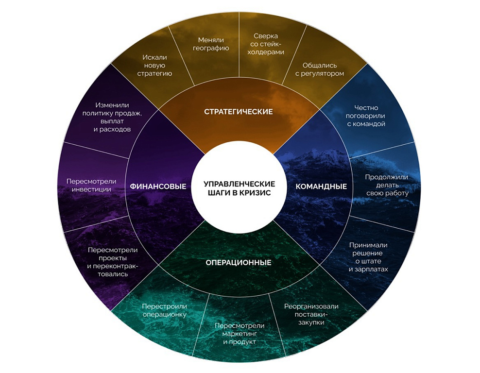 Стратегия. В самом начале кризиса большая часть руководителей (46% опрошенных) взяла паузу, чтобы осмотреться и не принимать скоропалительных решений. Другая часть (43%), напротив, активно проводила организационные изменения, искала новые ресурсы, направления, проекты. Как отмечали лидеры, занявшие активную позицию, сложившаяся ситуация ускорила то, что давно хотелось сделать стратегически: переехать, открыть новое направление бизнеса, начать выстраивать новое партнерство, улучшить что-то в себе или в компании.